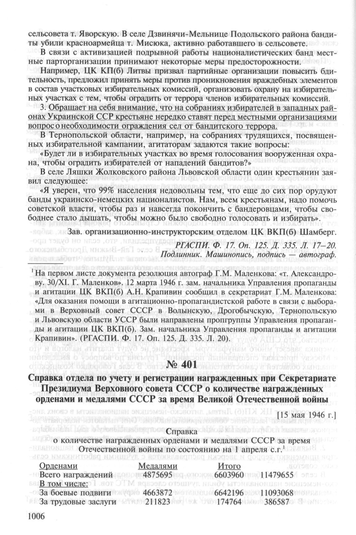 Справка отдела по учету и регистрации награжденных при Секретариате Президиума Верховного совета СССР о количестве награжденных орденами и медалями СССР за время Великой Отечественной войны. [15 мая 1946 г.] // ГА РФ. Ф. Р-7523. Oп. 17. Д. 353. Л. 11, 12. Подлинник. Машинопись, подпись — автограф.