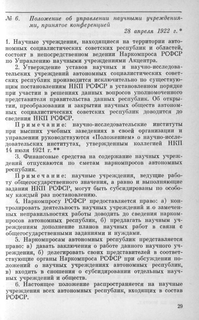 Из протоколов заседания конференции по урегулированию управления и финансирования научных учреждений, находящихся не территории советских договорных и автономных республик и национальных областей. Положение об управлении научными учреждениями, принятое конференцией. 28 апреля 1922 г. // ЦГА РСФСР, ф. 2307, оп. 2, д. 36, л. 4. Завер. копия.