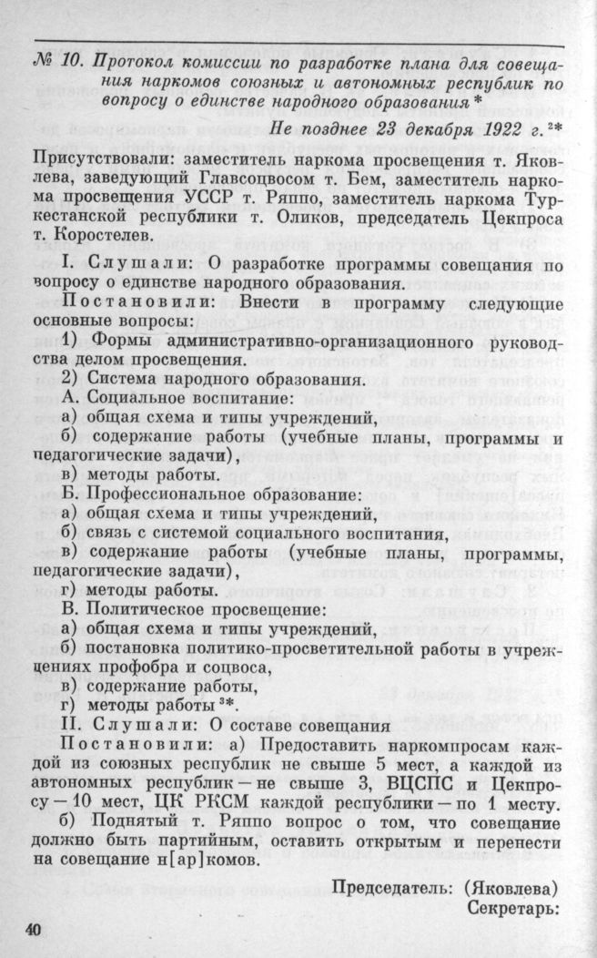 Протокол комиссии по разработке плана для совещания наркомов союзных и автономных республик по вопросу о единстве народного образования. Не позднее 23 декабря 1922 г. // ЦГА РСФСР, ф. 2306, оп. 1, д. 2230, л. 6. Завер. копия.