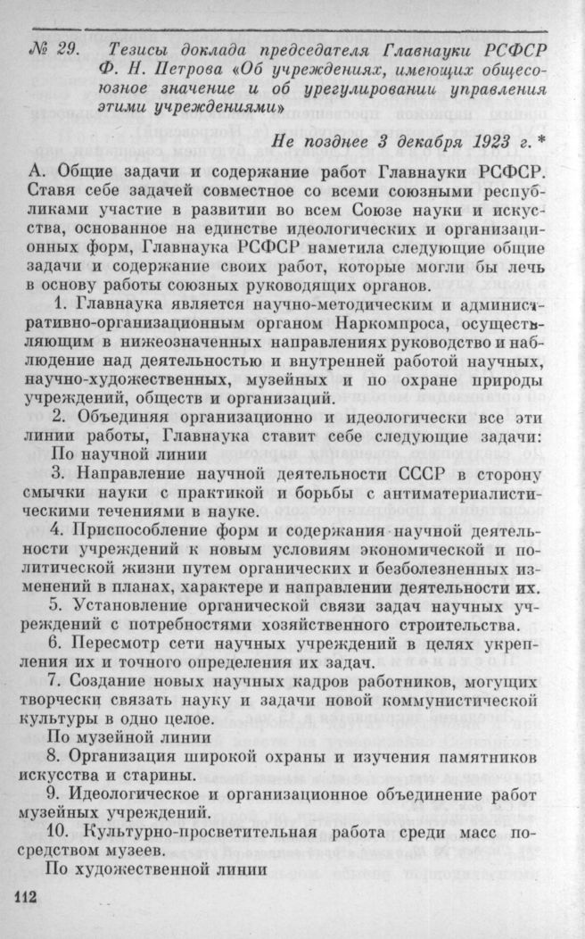 Тезисы доклада председателя Главнауки РСФСР Ф.Н. Петрова «Об учреждениях, имеющих общесоюзное значение и об урегулировании управления этими учреждениями». Не позднее 3 декабря 1923 г.