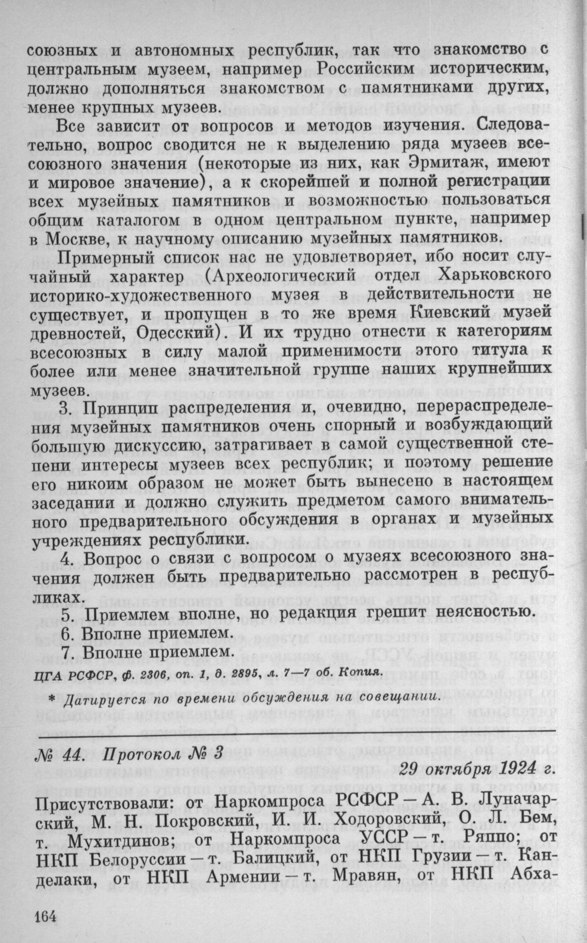 Из материалов совещания наркомов просвещения союзных и автономных республик. Протокол № 3. 29 октября 1924 г. // ЦГА РСФСР, ф. 2306, оп. 1, д. 2895, л. 10—10 об. Завер. копия.