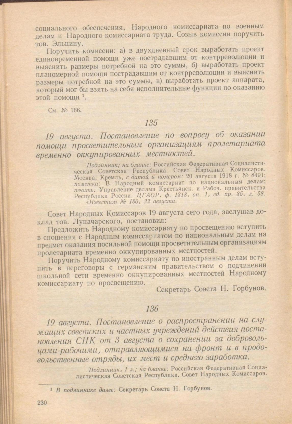 19 августа. Постановление по вопросу об оказании помощи просветительным организациям пролетариата временно оккупированных местностей // Подлинник; на бланке: Российская Федеративная Социалистическая Советская Республика. Совет Народных Комиссаров. Москва, Кремль, с датой и номером: 20 августа 1918 г. № 8491; пометка: В Народный комиссариат по национальным делам; печать: Управление делами Крестьянск. и Рабоч. правительства Республики России. ЦГАОР, ф. 1318, oп. 1, ед. хр. 35, л. 58. «Известия» № 180, 22 августа.