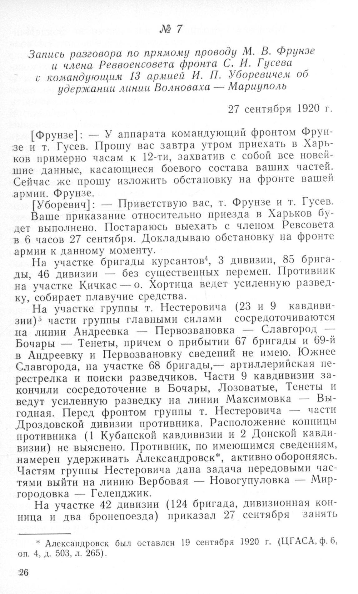 Запись разговора по прямому проводу М.В. Фрунзе и члена Реввоенсовета фронта С.И.Гусева с командующим 13 армией И.П. Уборевичем об удержании линии Волноваха — Мариуполь. 27 сентября 1920 г.