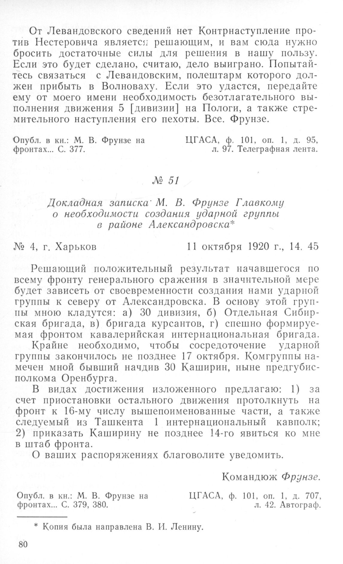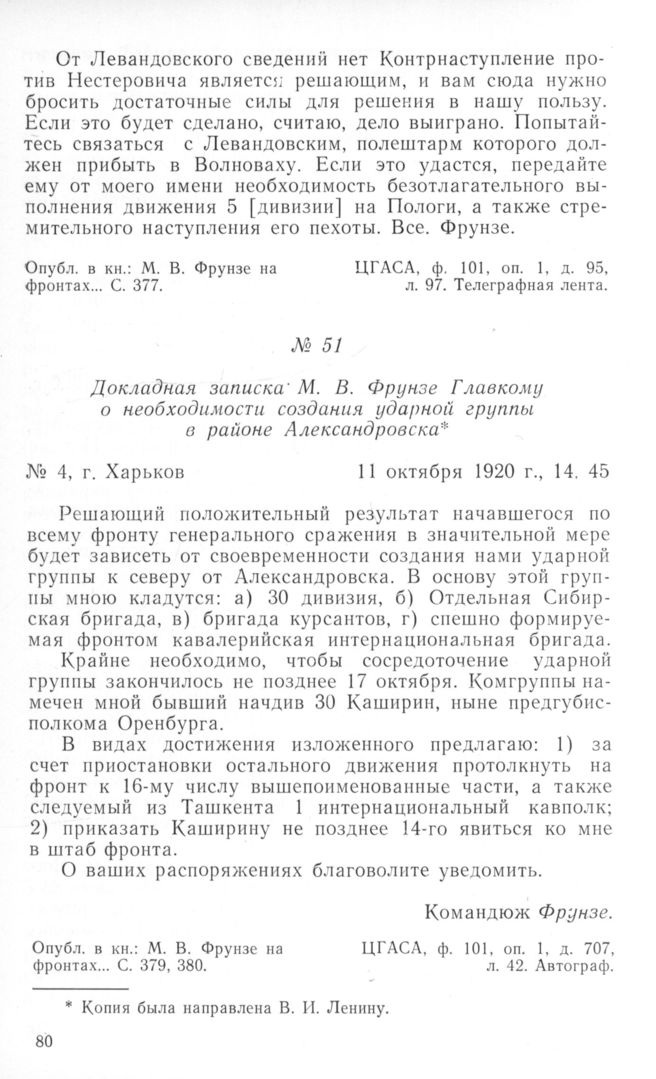 Докладная записка М.В. Фрунзе Главкому о необходимости создания ударной группы в районе Александровска. г. Харьков. 11 октября 1920 г. // ЦГАСА, ф. 101, oп. 1, д. 707, л. 42. Автограф. Опубл. в кн.: М.В. Фрунзе на фронтах... С. 379, 380.