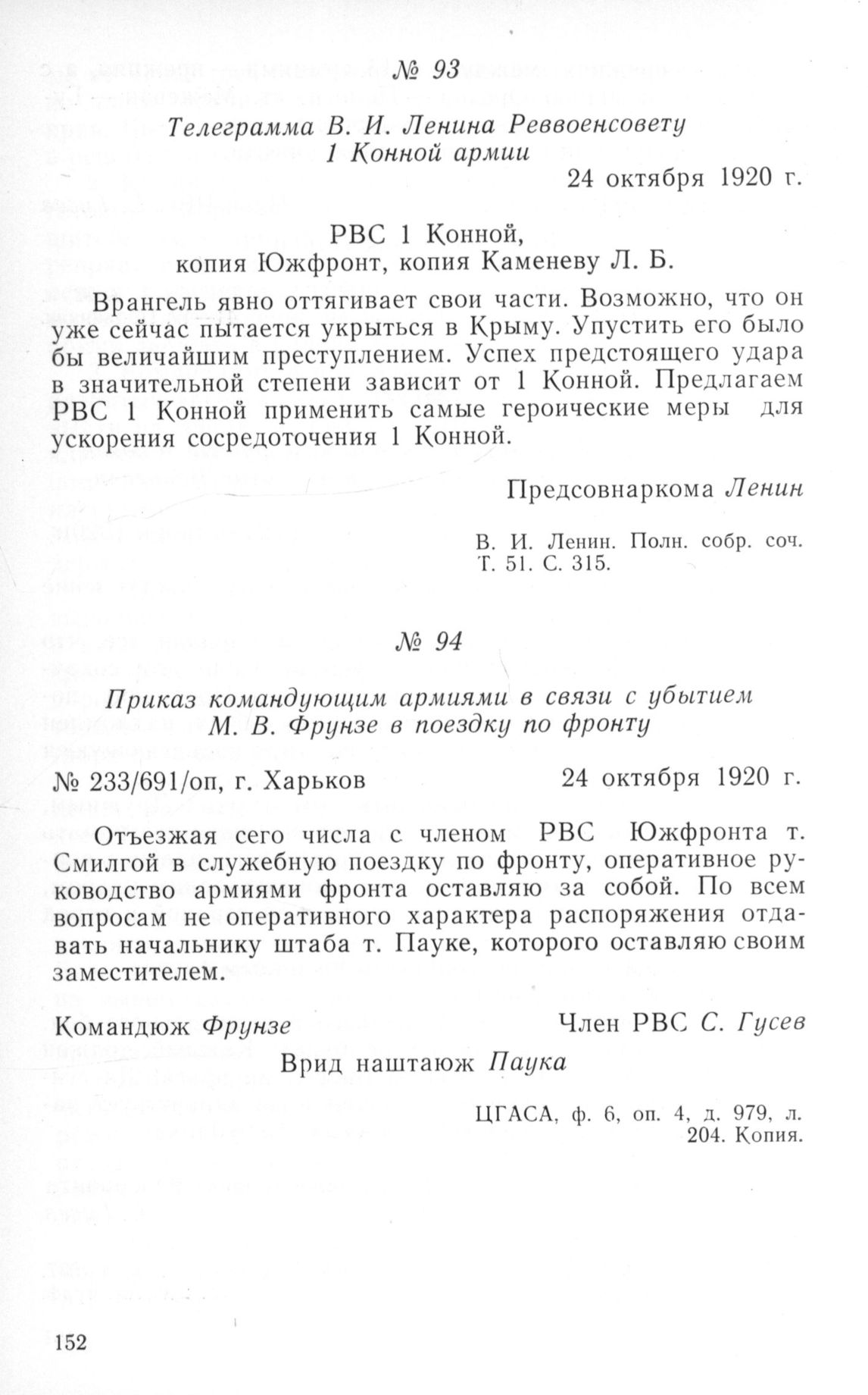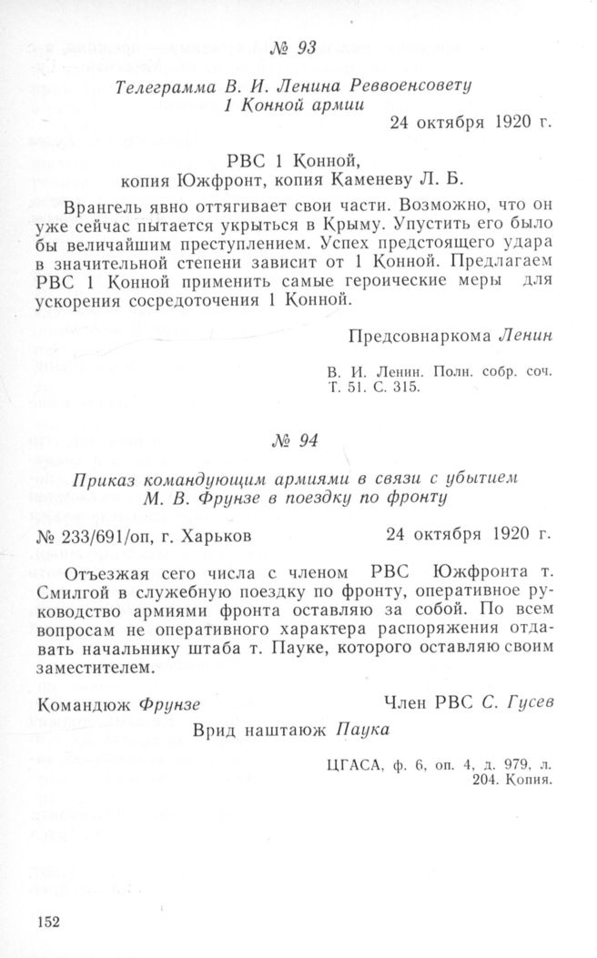 Приказ командующим армиями в связи с убытием М. В. Фрунзе в поездку по фронту. г. Харьков. 24 октября 1920 г. // ЦГАСА, ф. 6, оп. 4, д. 979, л. 204. Копия.
