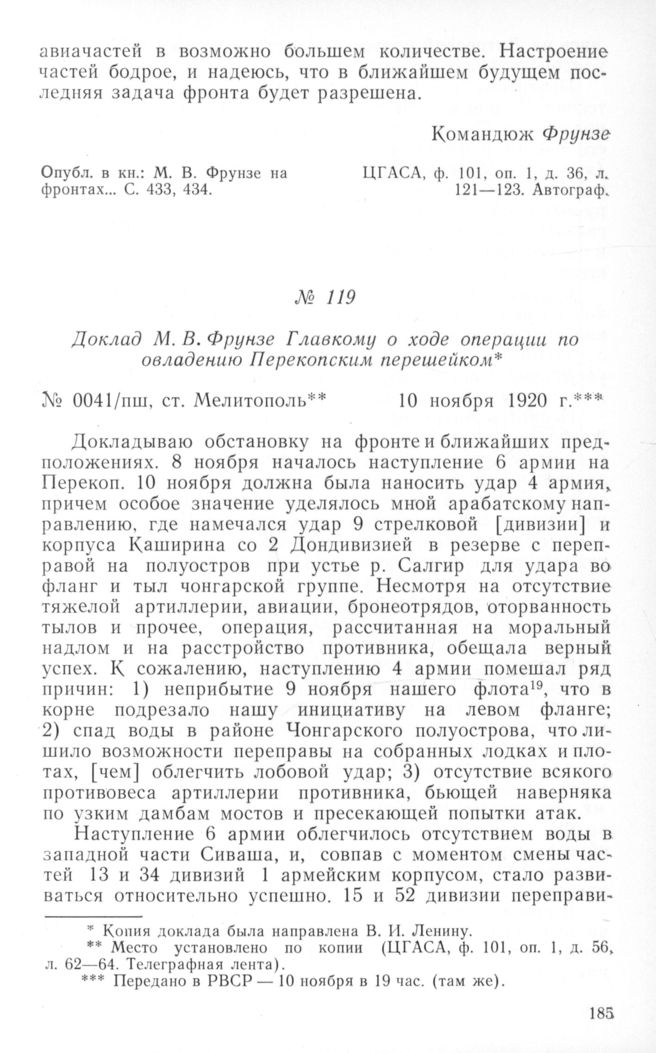 Доклад М.В. Фрунзе Главкому о ходе операции по овладению Перекопским перешейком. ст. Мелитополь. 10 ноября 1920 г. // ЦГАСА, ф. 101, oп. 1, д. 36, л. 77—86. Автограф. Опубл. в кн.: М.В. Фрунзе на фронтах... С. 434, 436.