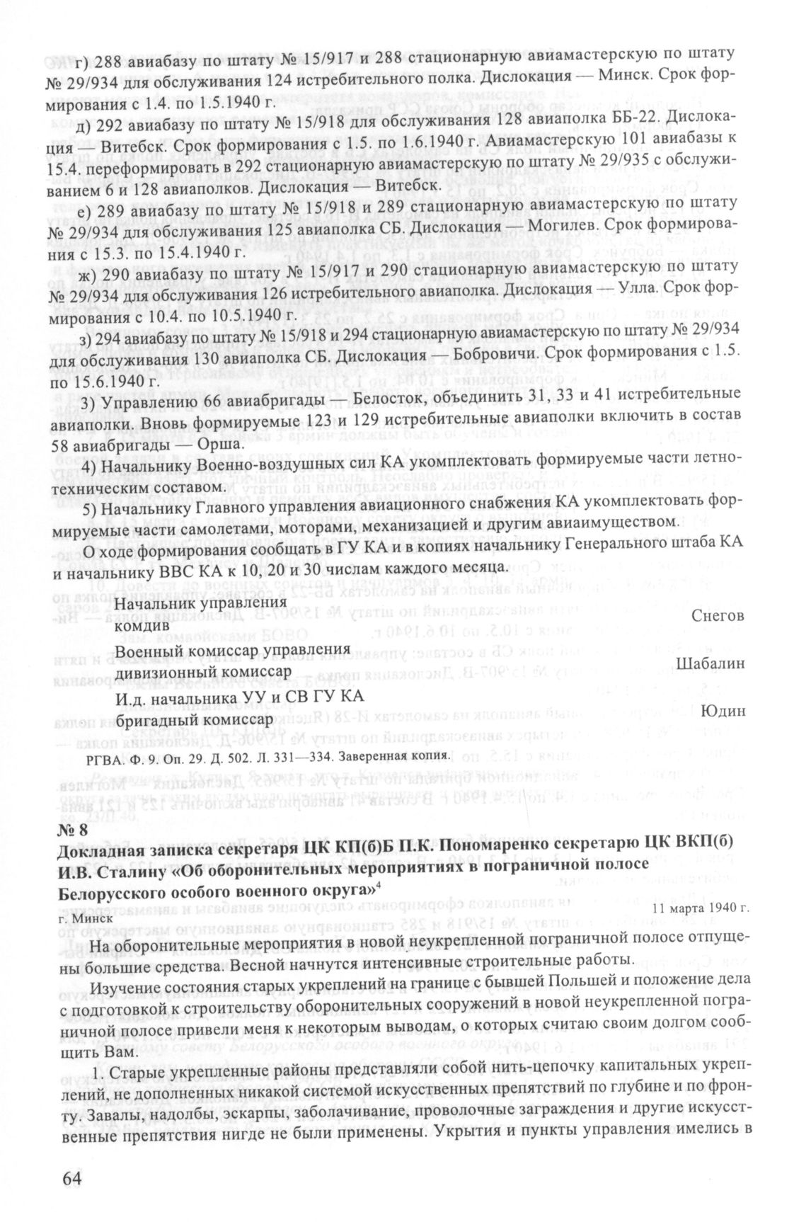 Докладная записка секретаря ЦК КП(б)Б П.К. Пономаренко секретарю ЦК ВКП(б) И.В. Сталину «Об оборонительных мероприятиях в пограничной полосе Белорусского особого военного округа». г. Минск. 11 марта 1940 г. // НАРБ. Ф. 4п. Оп. 21. Д. 1873. Л. 112-117. Отпуск. Опубликовано: Исторический архив. 2004. № 6. С. 46-49.