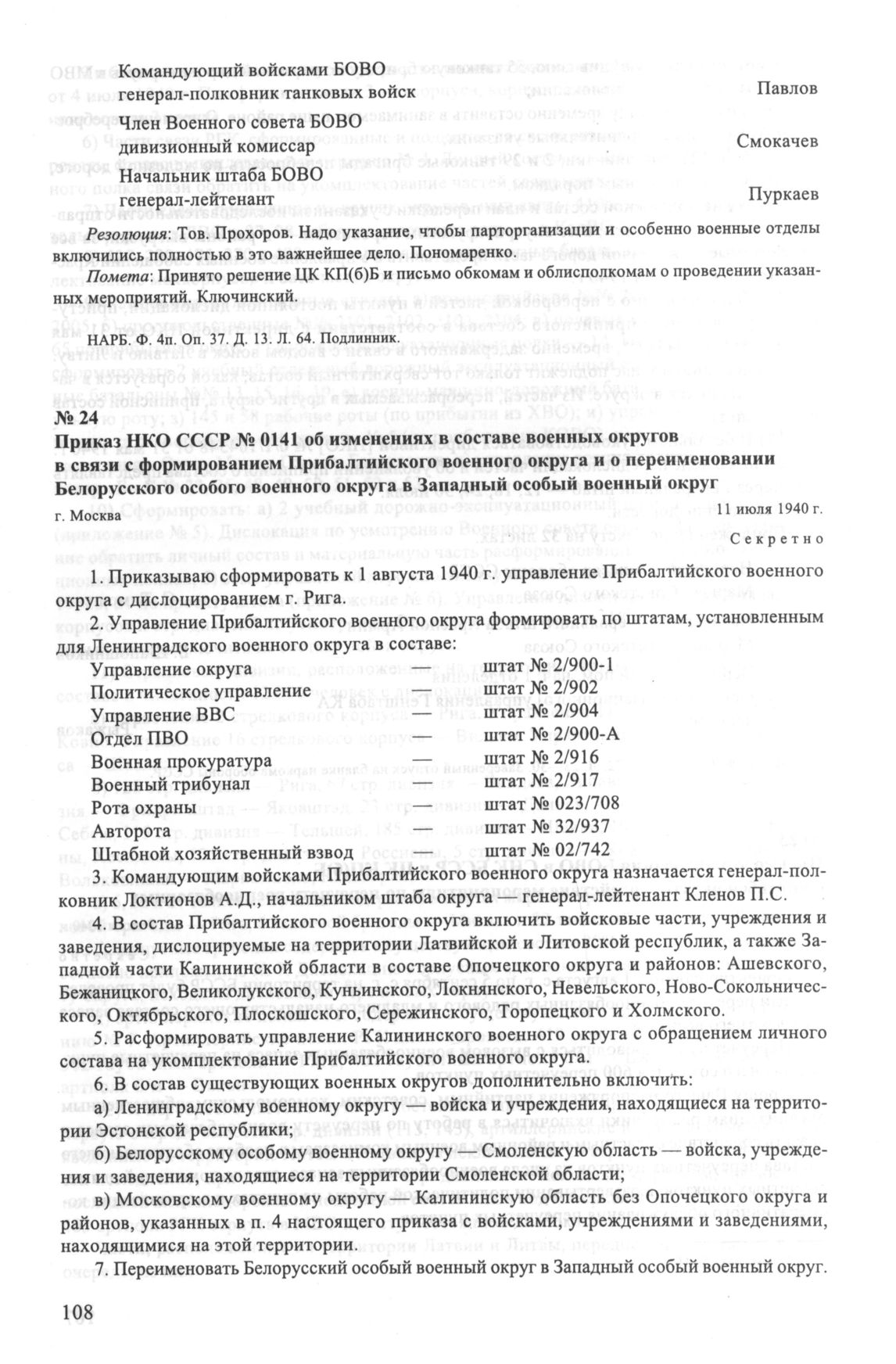 Приказ НКО СССР № 0141 об изменениях в составе военных округов в связи с формированием Прибалтийского военного округа и о переименовании Белорусского особого военного округа в Западный особый военный округ. г. Москва. 11 июля 1940 г. // РГВА Ф 4 Оп. 15. Д. 22. Л. 172-172об. Типографский экз. Частично опубликовано: Военно-исторический журнал. 1989. № 11. С. 18.