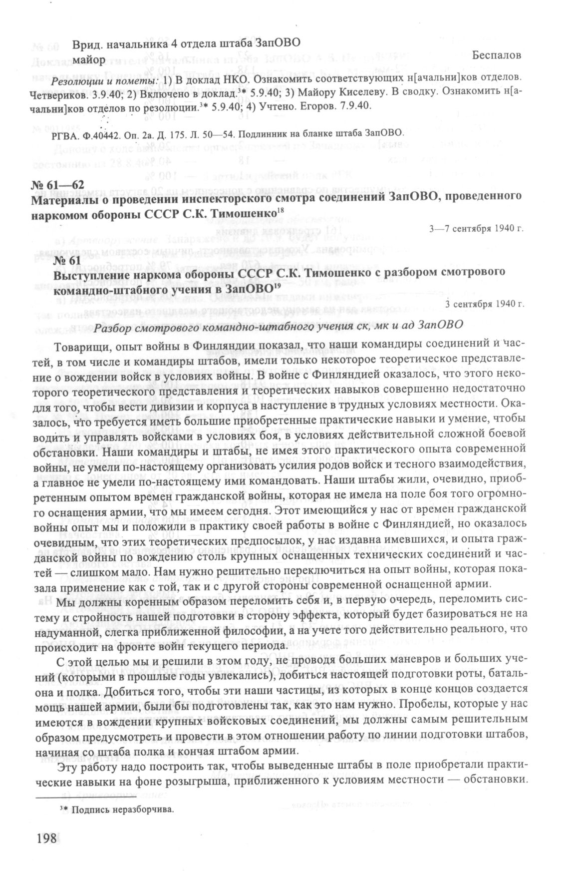 Выступление наркома обороны СССР С.К. Тимошенко с разбором смотрового командно-штабного учения в ЗапОВО. 3 сентября 1940 г. // РГВА. Ф. 4. Оп. 18. Д. 63. Л. 36-55. Стенограмма. Подлинник, экз. 1.