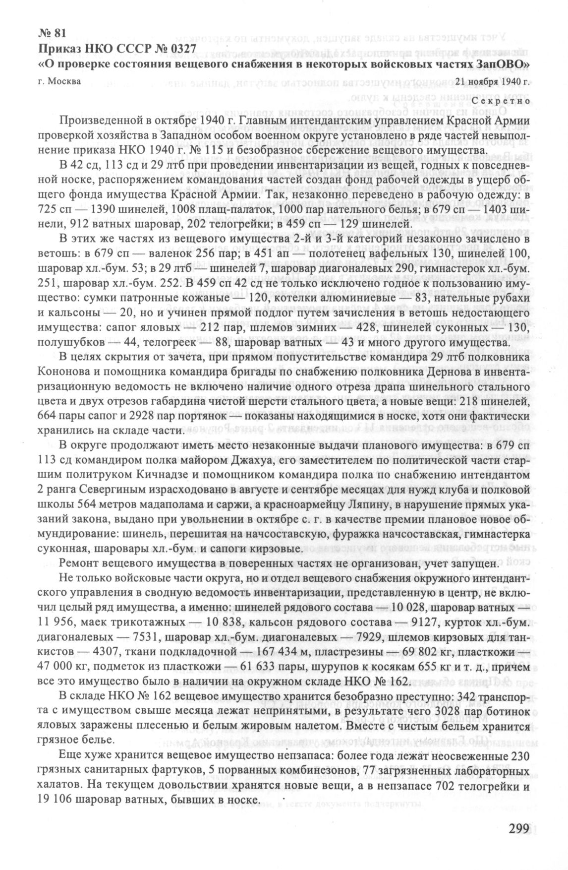 Приказ НКО СССР № 0327 «О проверке состояния вещевого снабжения в некоторых войсковых частях ЗапОВО». г. Москва. 21 ноября 1940 г. // РГВА. Ф. 22. Оп. 32. Д. 3935. Л. 194-195. Типографский экз.