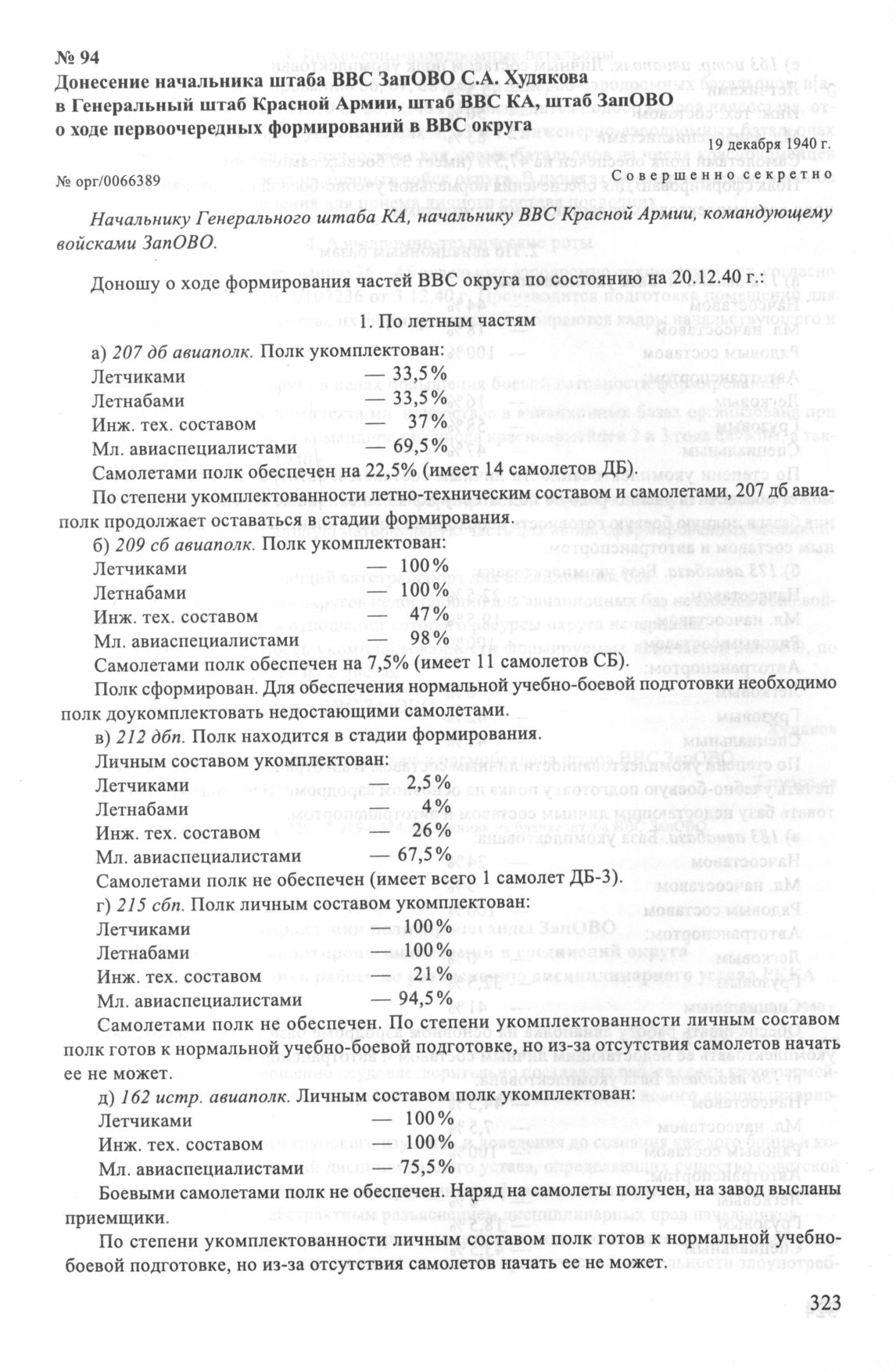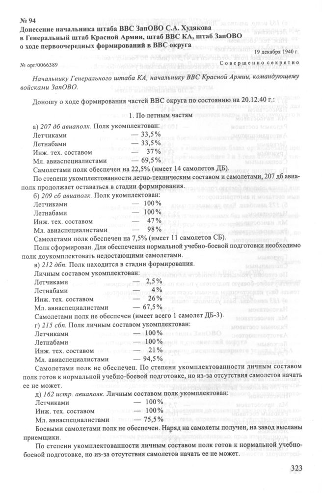 Донесение начальника штаба ВВС ЗапОВО С.А. Худякова в Генеральный штаб Красной Армии, штаб ВВС КА, штаб ЗапОВО о ходе первоочередных формирований в ВВС округа.19 декабря 1940 г. // РГВА. Ф. 40442. Оп. 2а. Д. 129. Л. 219-224. Подлинник на бланке штаба ВВС ЗапОВО.