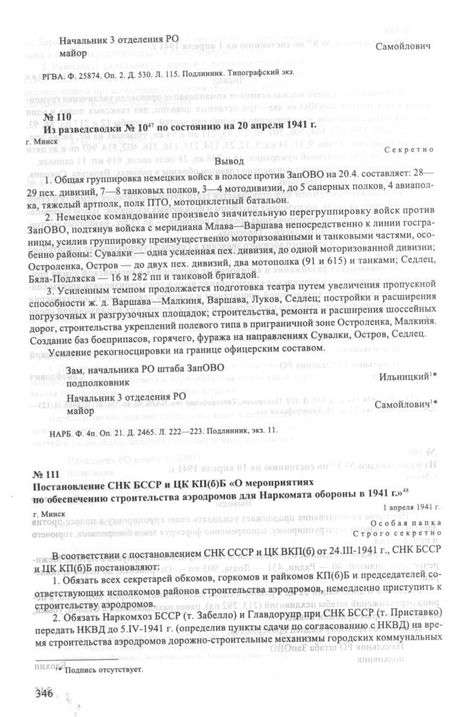 Выводы из разведсводки № 10 разведывательного отдела штаба ЗапОВО по состоянию на 20 апреля 1941 г. г. Минск // НАРБ. Ф. 4п. Оп. 21. Д. 2465. Л. 222-223. Подлинник, экз. 11.