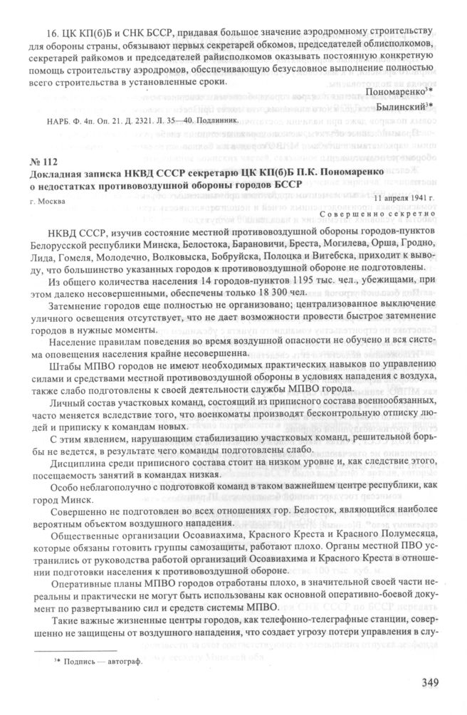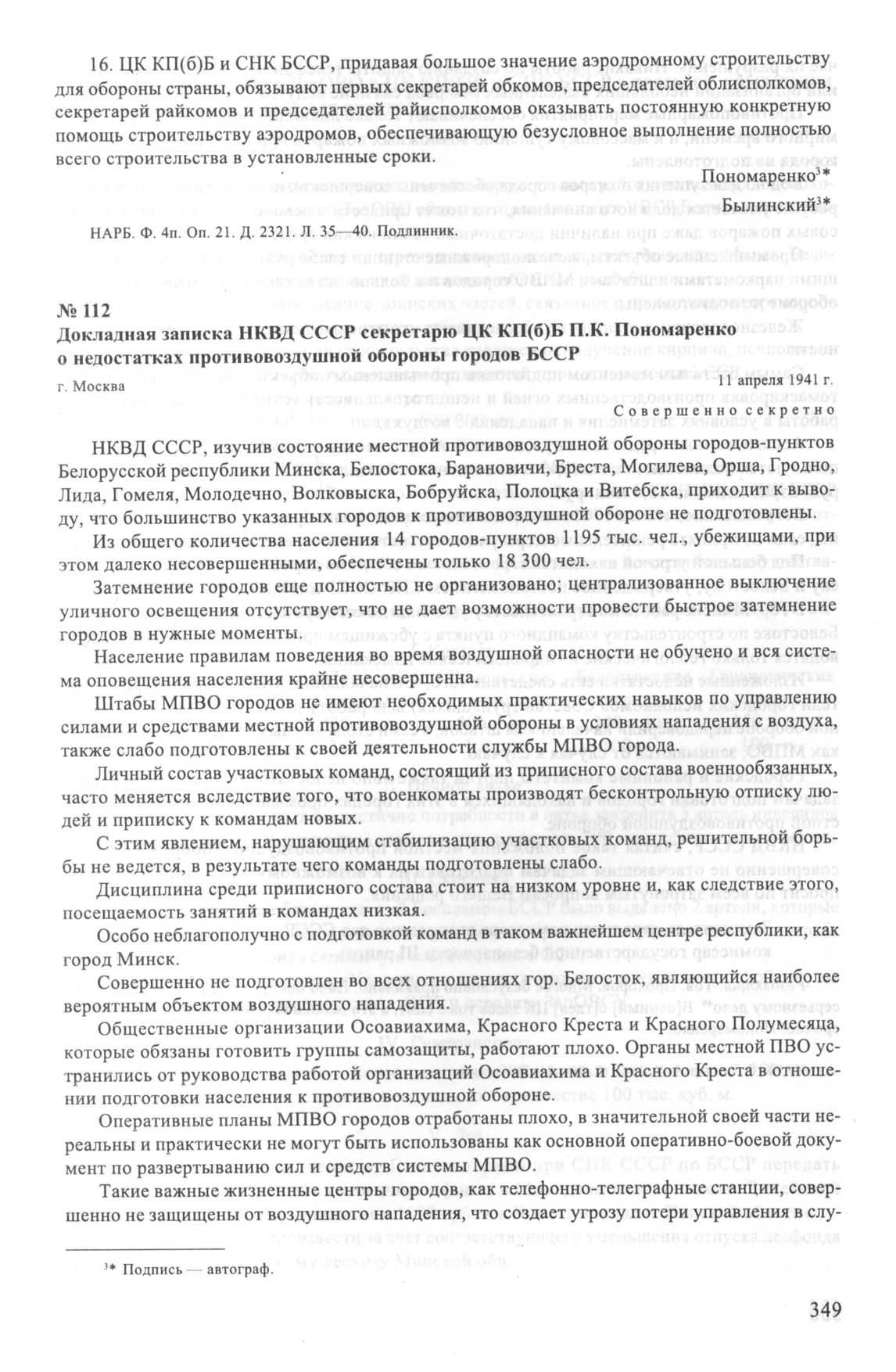 Докладная записка НКВД СССР секретарю ЦК КП(б)Б П.К. Пономаренко о недостатках противовоздушной обороны городов БССР. г. Москва. 11 апреля 1941 г.