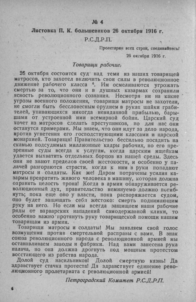 Листовка П. К. большевиков. 26 октября 1916 г. // М. Г. Флеер. «Петербургский Комитет большевиков» в годы войны. Л., Прибой, 1927 г.