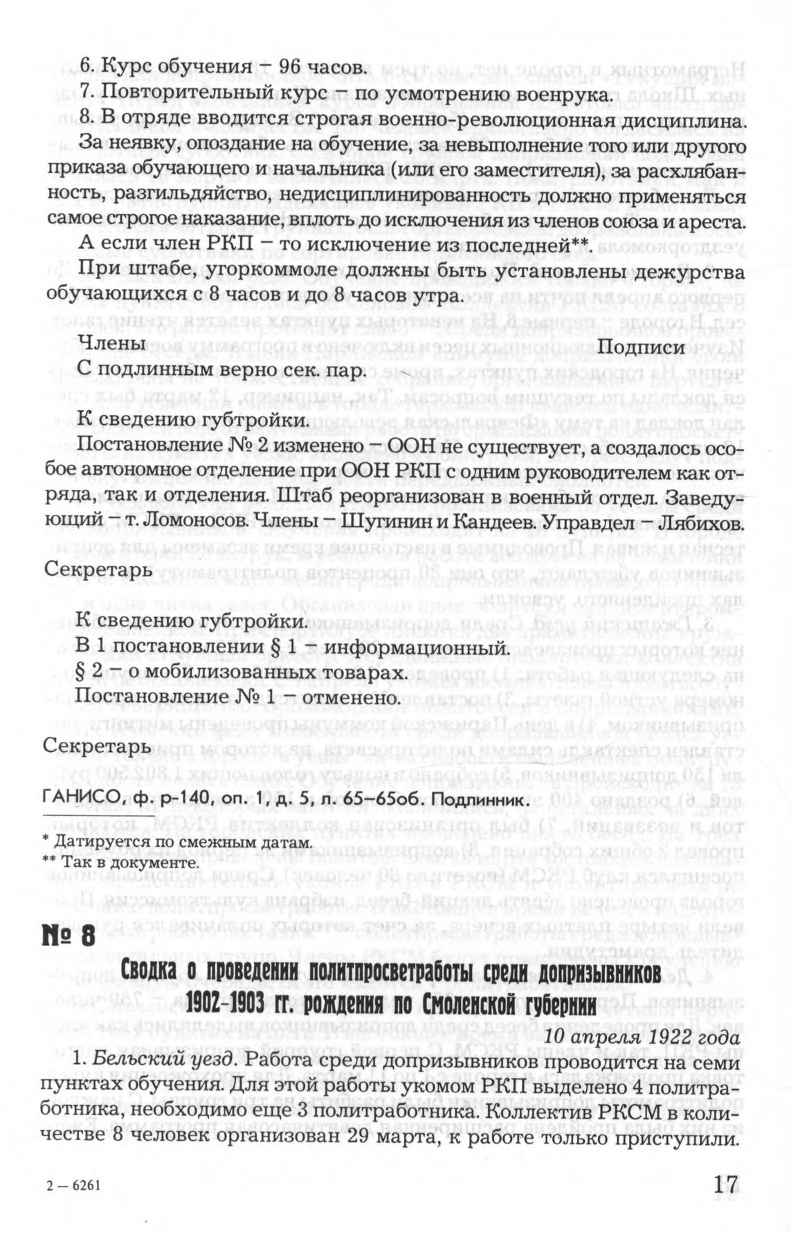 Сводка о проведении политпросветработы среди допризывников 1902-1903 гг. рождения по Смоленской губернии. 10 апреля 1922 года // ГАНИСО, Ф. Р-140, Оп.1, Д. 69, Л. 33-34об. Копия.