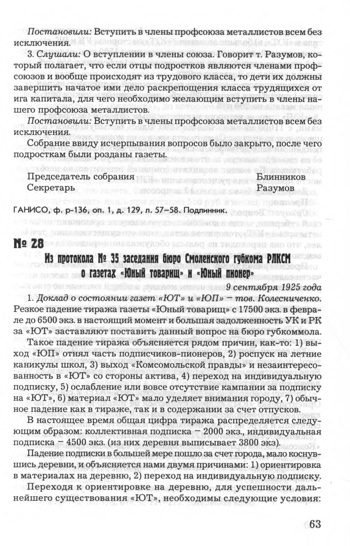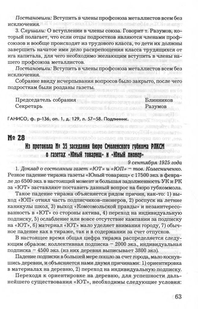 Из протокола № 35 заседания бюро Смоленского губкома РЛКСМ о газетах «Юный товарищ» и «Юный пионер». 9 сентября 1925 года // ГАНИСО, Ф. Р-140, Оп.1, Д. 316, Л. 221-222. Заверенная копия.