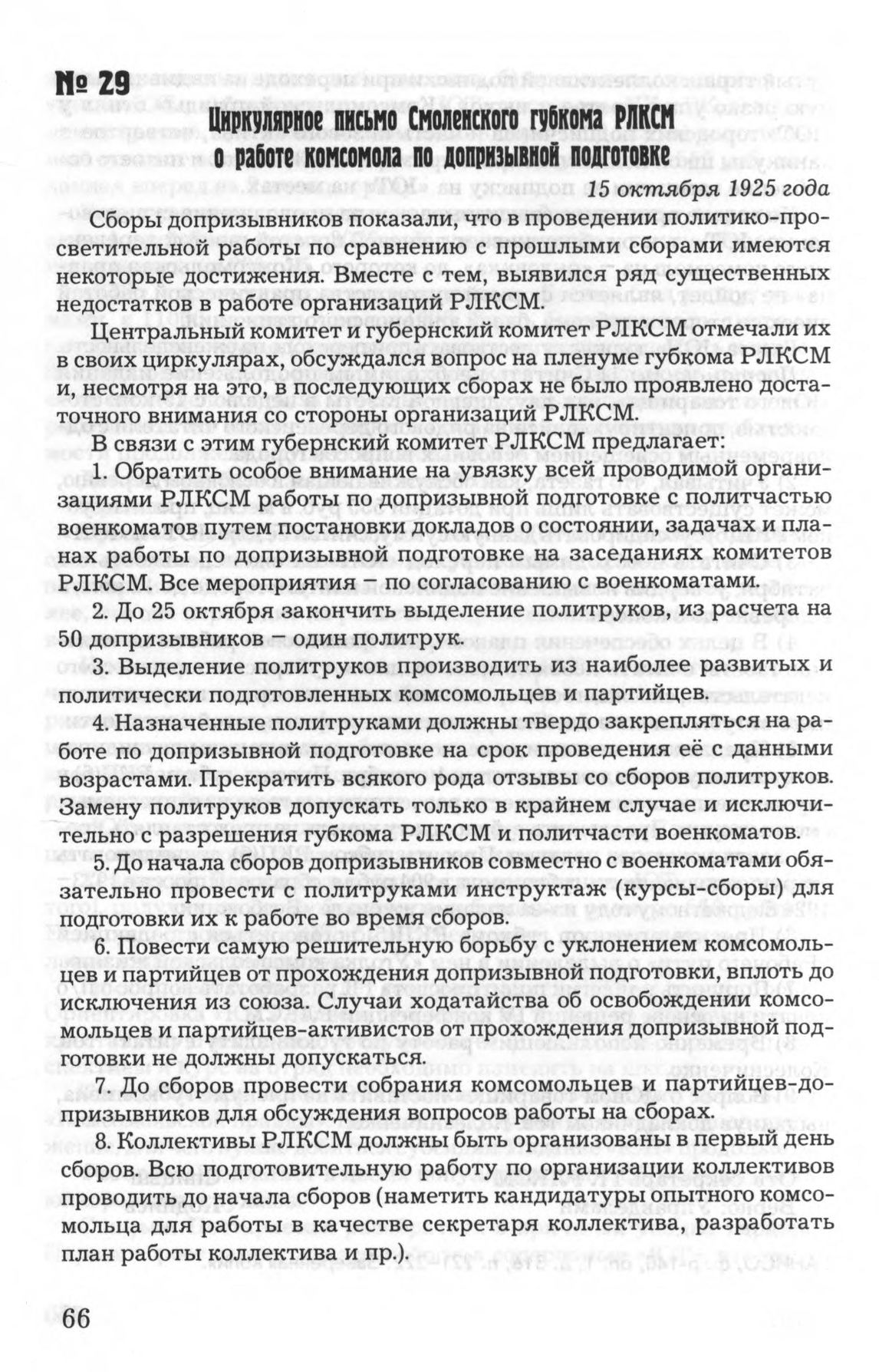 Циркулярное письмо Смоленского губкома РЛКСМ о работе комсомола по допризывной подготовке. 15 октября 1925 года
