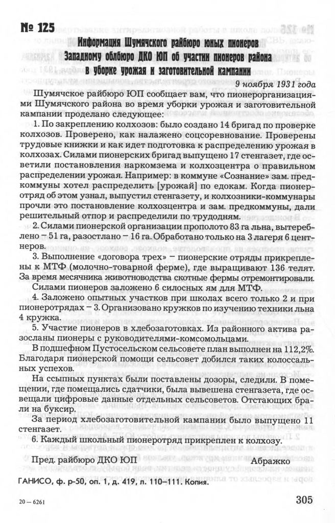 Информация Шумячского райбюро юных пионеров Западному облбюро ДКО ЮП об участии пионеров района в уборке урожая и заготовительной кампании. 9 ноября 1931 года // ГАНИСО, Ф. Р-50, Оп. 1, Д. 419, Л. 110-111. Копия.