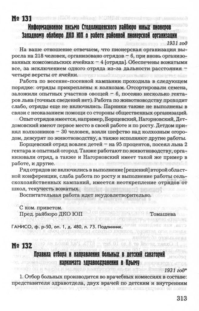 Информационное письмо Стодолищенского райбюро юных пионеров Западному облбюро ДКО ЮП о работе районной пионерской организации. 1931 год // ГАНИСО, Ф. Р-50, Оп.1, Д. 480, Л. 73. Подлинник.