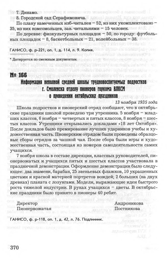 Информация неполной средней школы трудновоспитуемых подростков г. Смоленска отделу пионеров горкома ВЛКСМ о проведении октябрьских праздников. 13 ноября 1935 года // ГАНИСО, Ф. Р-118, Оп.1, Д. 42, Л. 76. Подлинник.