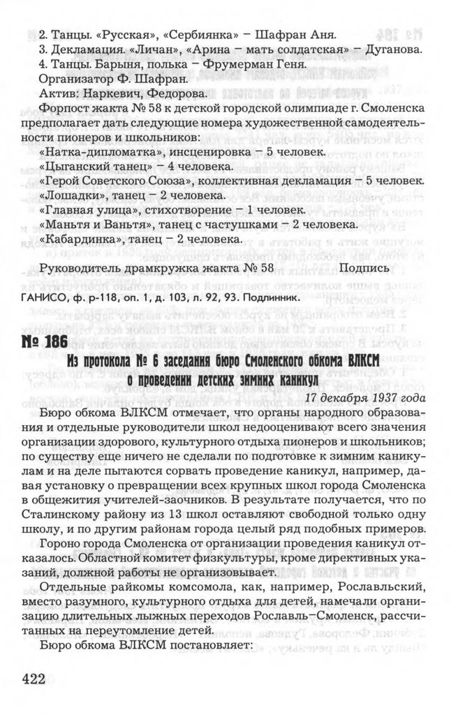 Из протокола № 6 заседания бюро Смоленского обкома ВЛКСМ о проведении детских зимних каникул. 17 декабря 1937 года