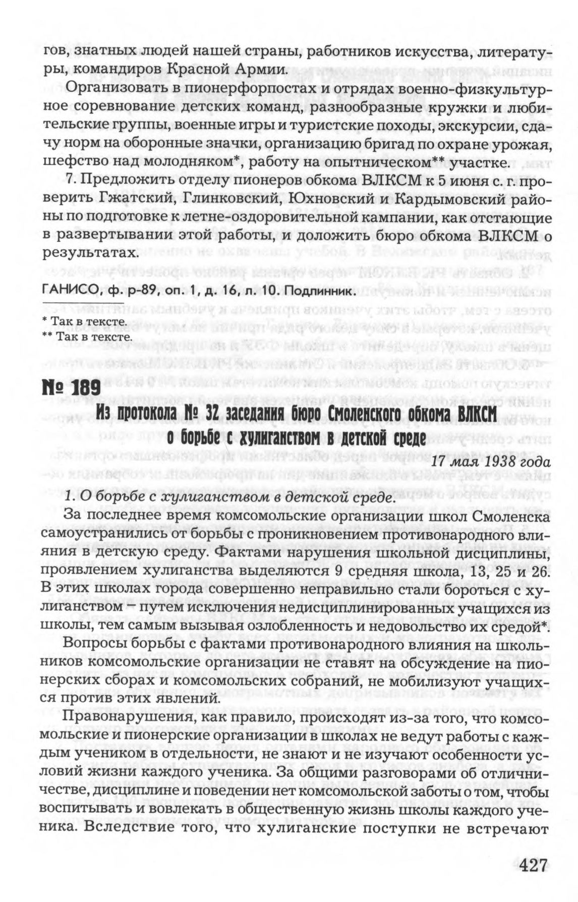 Из протокола № 32 заседания бюро Смоленского обкома ВЛКСМ о борьбе с хулиганством в детской среде. 17 мая 1938 года // ГАНИСО, Ф. Р-89, Оп. 1, Д. 16, Л. 8. Подлинник.