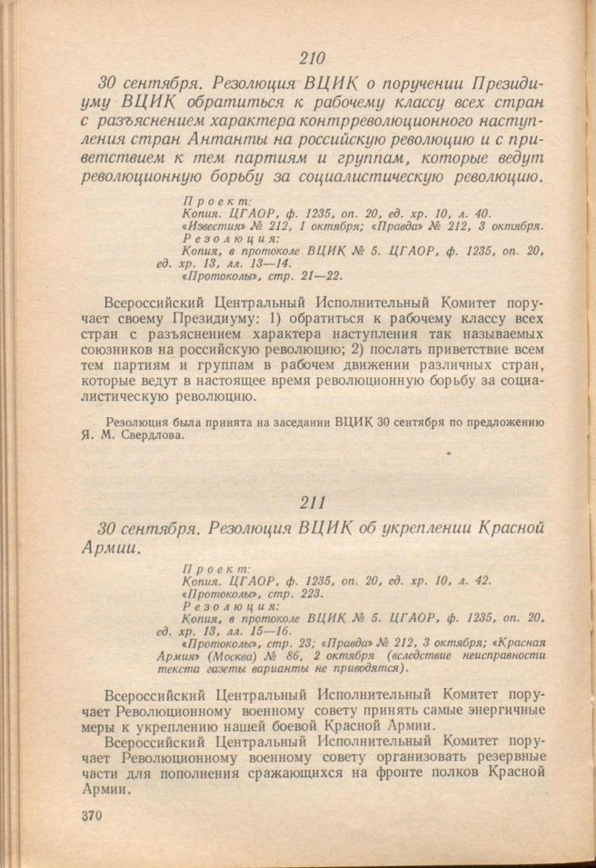 30 сентября. Резолюция ВЦИК об укреплении Красной Армии // П р о е к т: Копия. ЦГАОР, ф. 1235, oп. 20, ед. хр. 10, л. 42. «Протоколы», стр. 223. Р е з о л ю ц и я: Копия, в протоколе ВЦИК № 5. ЦГАОР, ф. 1235, oп. 20, ед. хр. 13, лл. 15—16. «Протоколы», стр. 23; «Правда» № 212, 3 октября; «Красная Армия» (Москва) № 86, 2 октября (вследствие неисправности текста газеты варианты не приводятся).