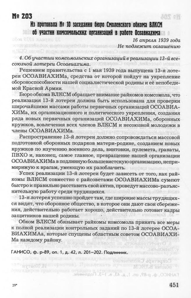 Из протокола № 10 заседания бюро Смоленского обкома ВЛКСМ об участии комсомольских организаций в работе Осоавиахима. 16 апреля 1939 // ГАНИСО, Ф. Р-89, Оп. 1, Д. 42, Л. 201-202. Подлинник.