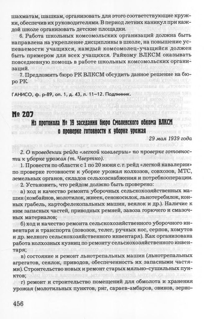 Из протокола № 19 заседания бюро Смоленского обкома ВЛКСМ о проверке готовности к уборке урожая. 29 мая 1939 года // ГАНИСО, Ф. Р-89, Оп. 1, Д. 43, Л. 90-93. Подлинник.