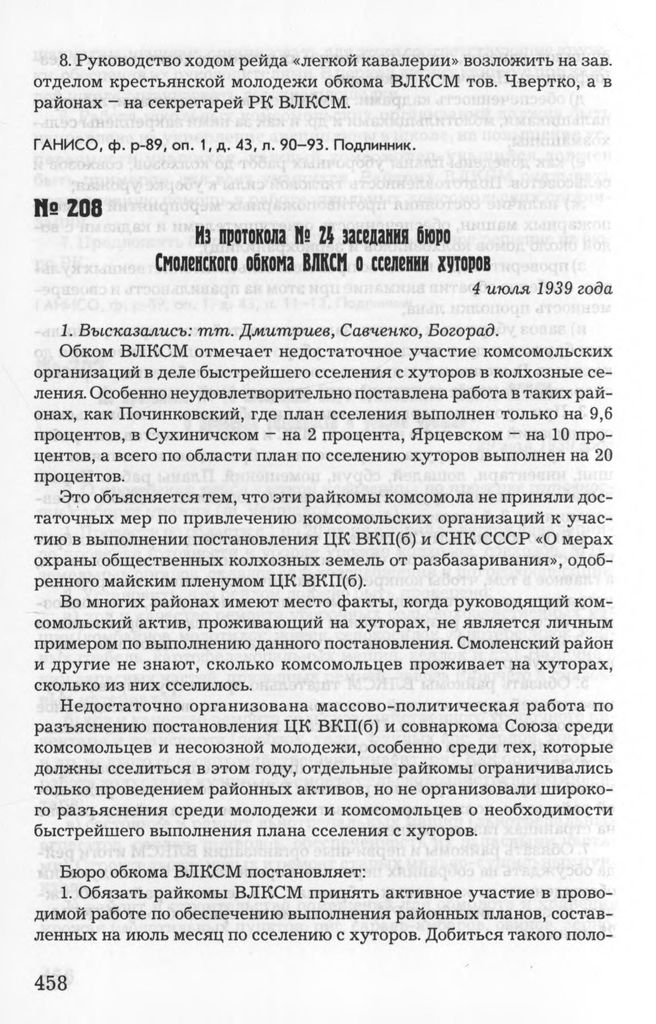 Из протокола № 24 заседания бюро Смоленского обкома ВЛКСМ о сселении хуторов. 4 июля 1939 года // ГАНИСО, Ф. Р-89, Оп. 1, Д. 43, Л. 181-183. Подлинник.