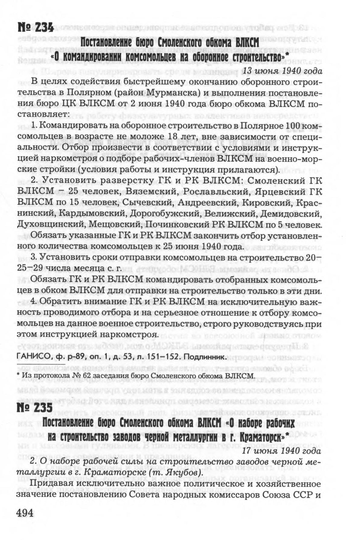 Постановление бюро Смоленского обкома ВЛКСМ «О командировании комсомольцев на оборонное строительство». 13 июня 1940 года