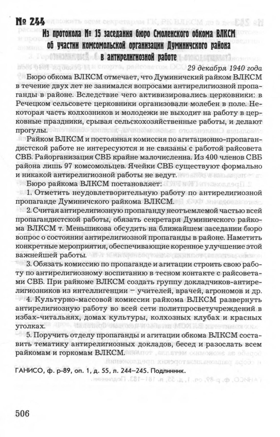 Из протокола № 15 заседания бюро Смоленского обкома ВЛКСМ об участки комсомольской организации Думиничского района в антирелигиозной работе. 29 декабря 1940 года // ГАНИСО, Ф. Р-89, Оп. 1, Д. 55, Л. 244-245. Подлинник.