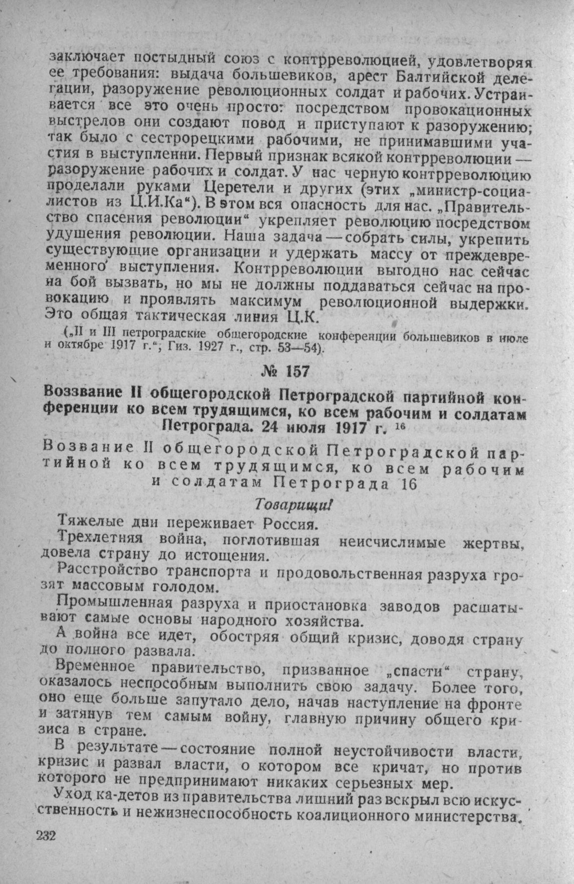 Воззвание II общегородской Петроградской партийной конференции ко всем трудящимся, ко всем рабочим и солдатам Петрограда. 24 июля 1917 г. // II и III петроградские общегородские конференции большевиков в июле и октябре 1917 г., Гиз. 1927 г., стр. 101—105.