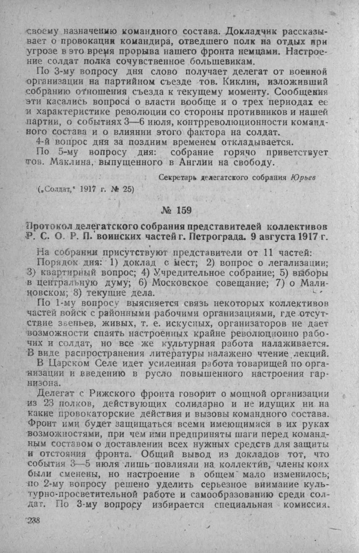 Протокол делегатского собрания представителей коллективов Р.С.Д.Р.П. воинских частей г. Петрограда. 9 августа 1917 г. // Солдат, 1917 г., № 25.