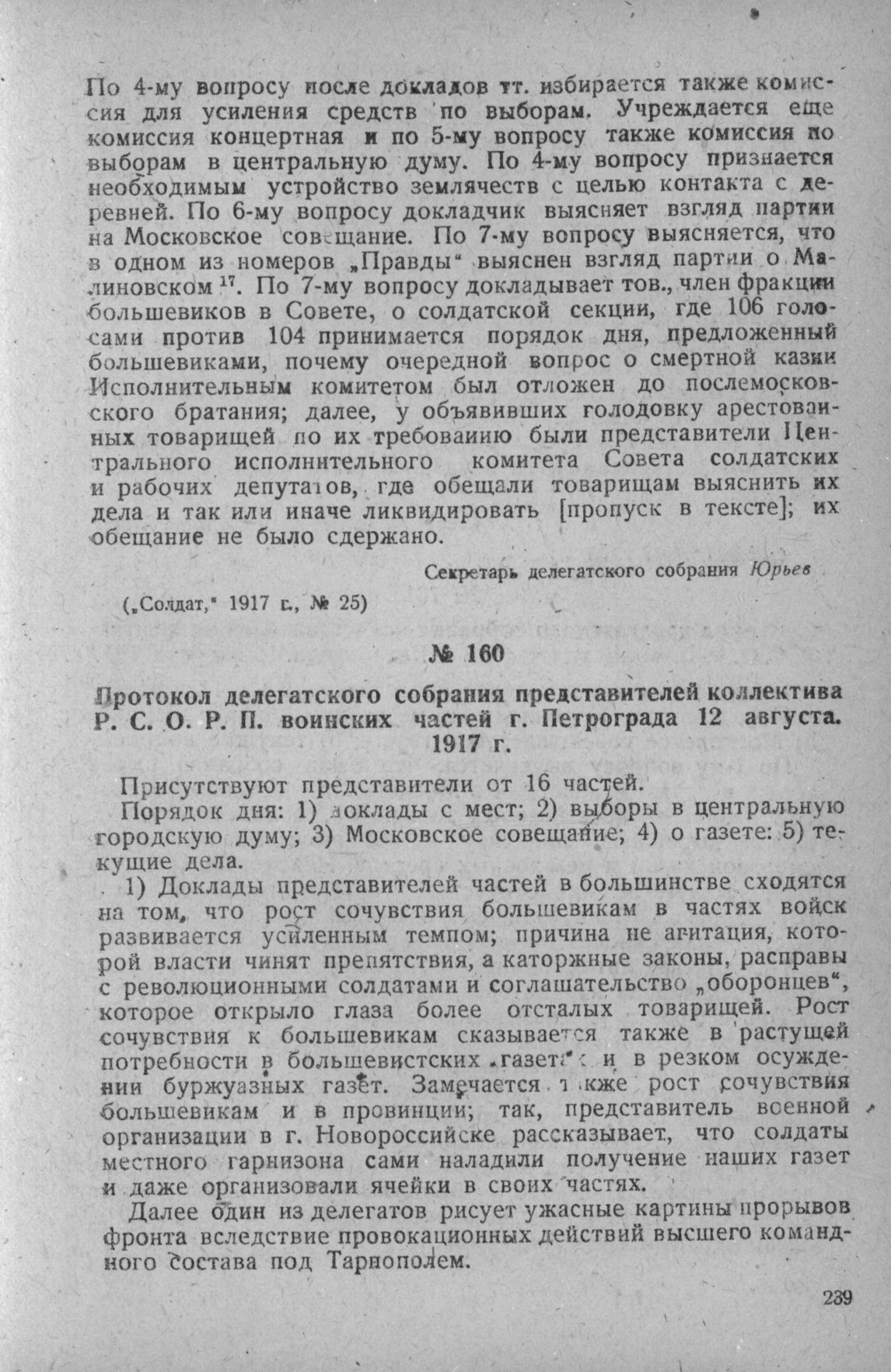 Протокол делегатского собрания представителей коллектива Р.С.Д.Р.П. воинских частей г. Петрограда. 12 августа 1917 г. // Солдат, 1917 г., № 25.