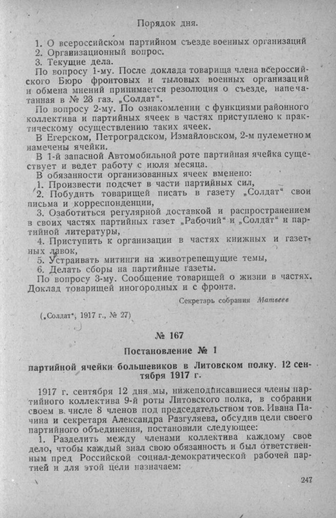 Постановление № 1 партийной ячейки большевиков в Литовском полку. 12 сентября 1917 г. // Солдат, 1917 г., № 27.