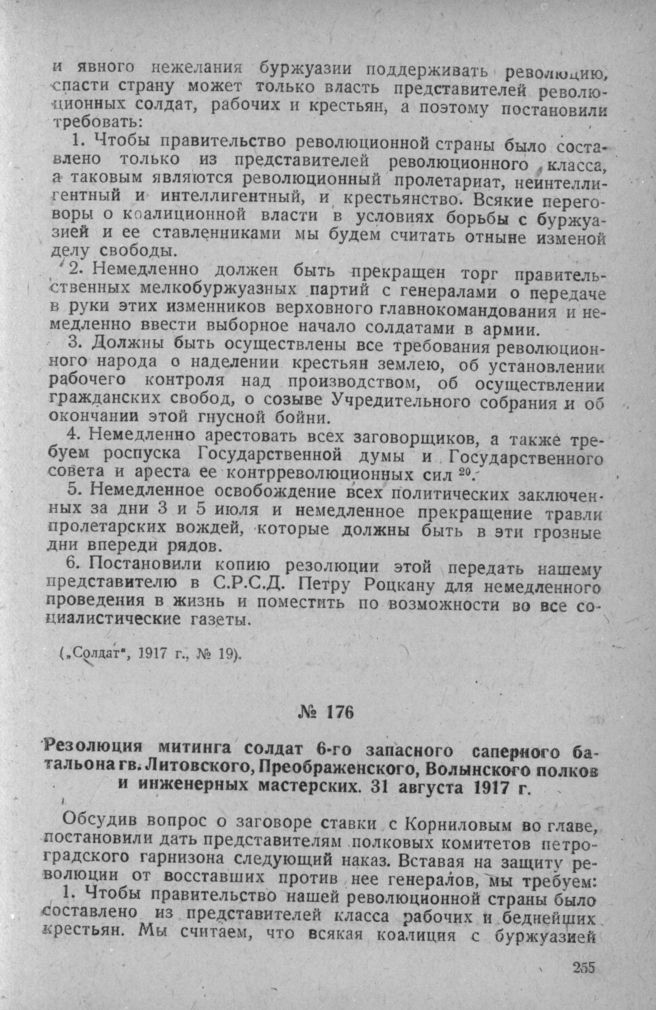 Резолюция митинга солдат 6-го запасного саперного батальона гв. Литовского, Преображенского, Волынского полков и инженерных мастерских. 31 августа 1917 г. // Солдат, 1917 г., № 15.