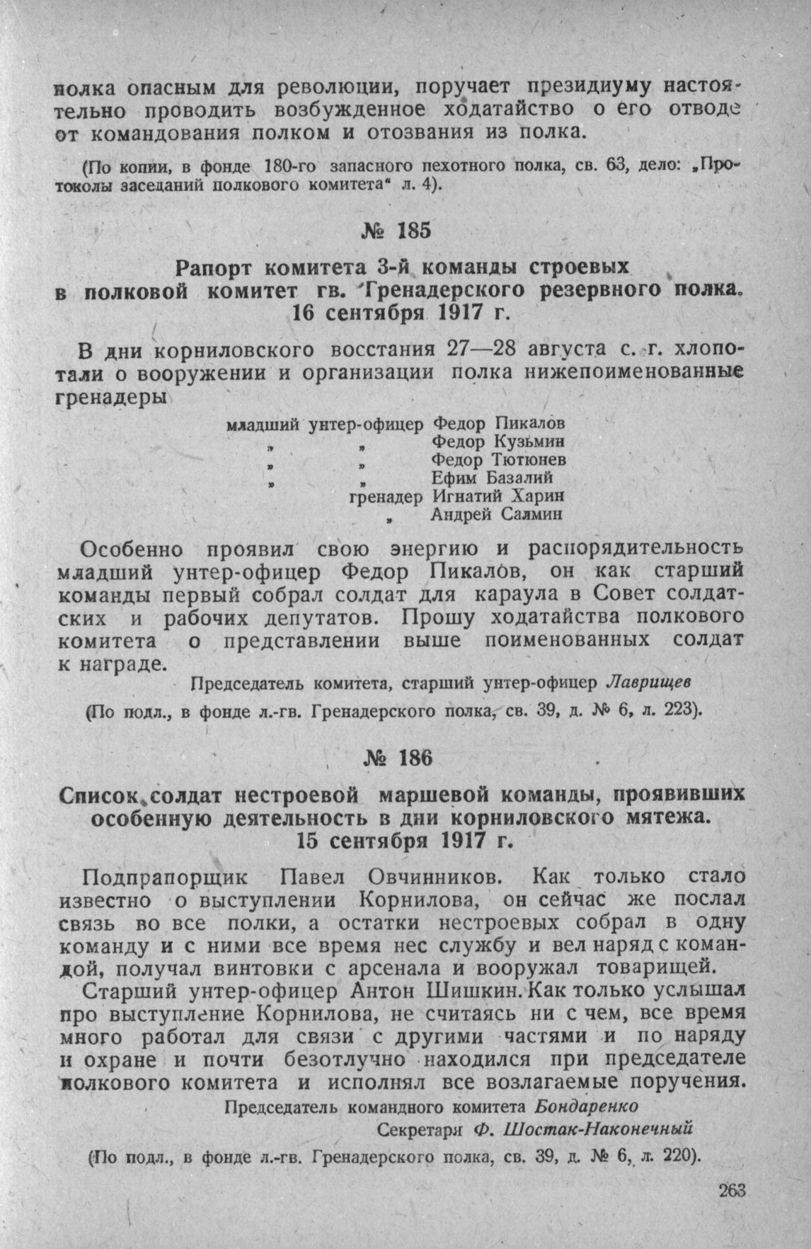 Рапорт комитета 3-й команды строевых в полковой комитет гв. Гренадерского резервного полка. 16 сентября 1917 г. // Фонд л.-гв. Гренадерского полка, св. 39, д. № 6, л. 223.