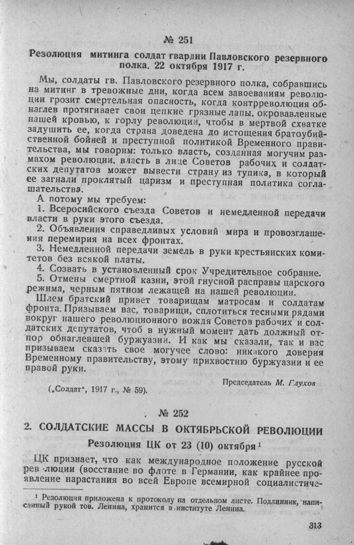 Резолюция ЦК от 23 (10) октября // Протоколы Центрального комитета Р.С.Д.Р.П., август 1917—февраль 1918 под общей редакцией М. А. Савельева, подготовил к печати В. Рахметов ГИЗ, М.-Л., 1929, стр. 101.