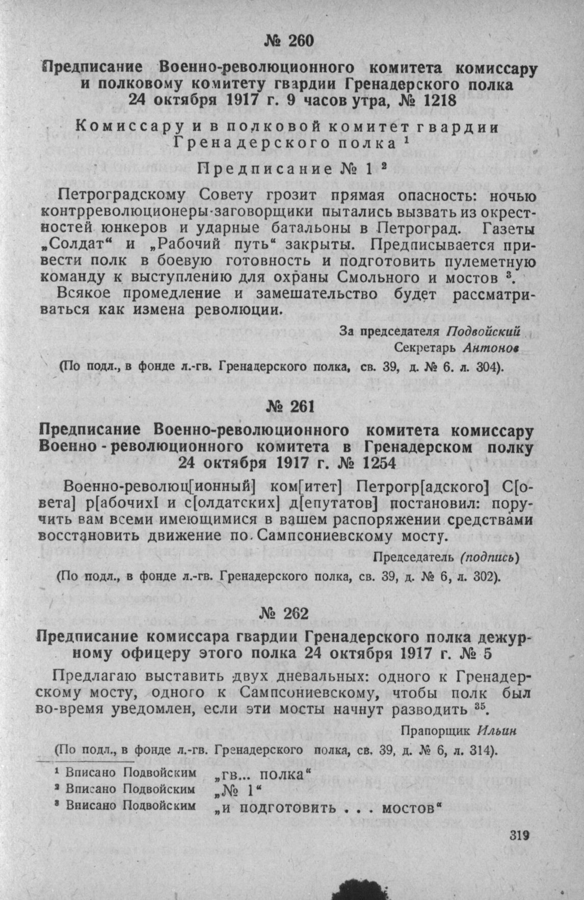 Предписание комиссара гвардии Гренадерского полка дежурному офицеру этого полка 24 октября 1917 г. № 5 // Фонд л.-гв. Гренадерского полка, св. 39, д. № 6, л. 314.