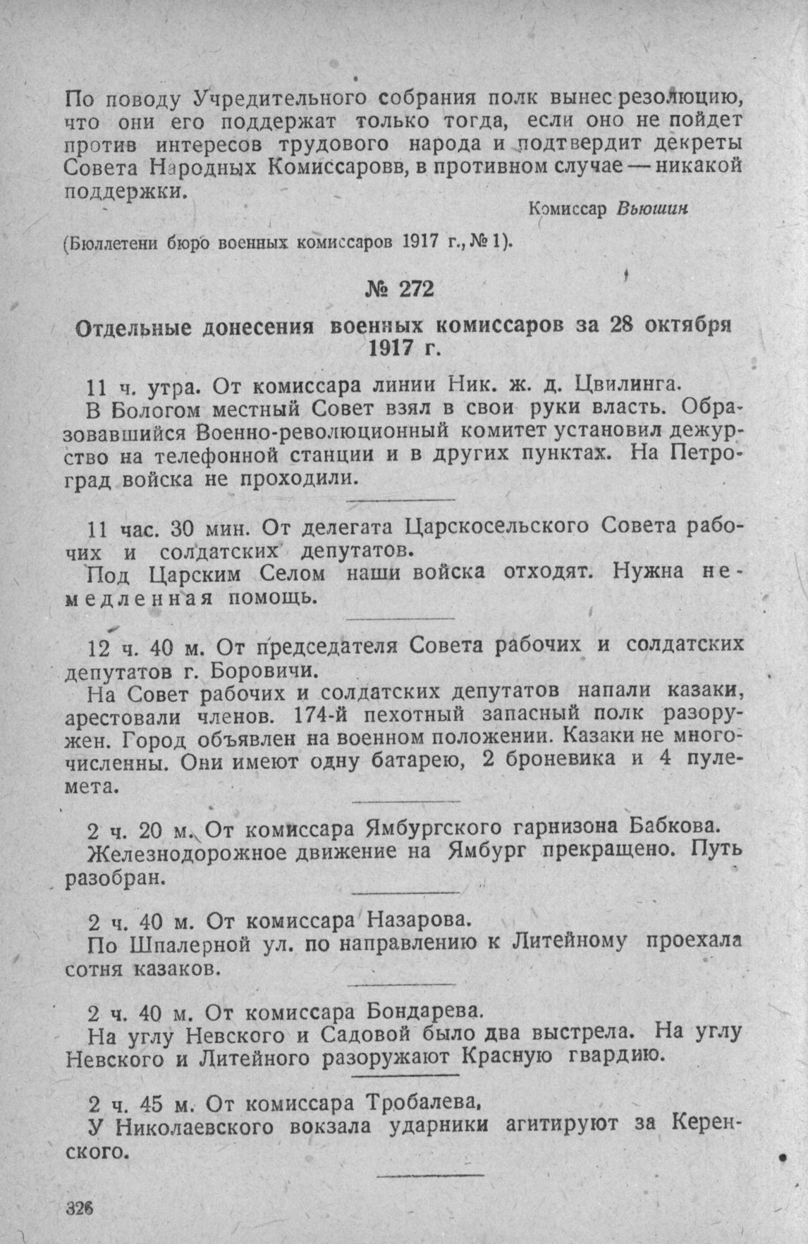 Отдельные донесения военных комиссаров за 28 октября 1917 г. // Бюллетени бюро военных комиссаров, 1917 г., № 2.