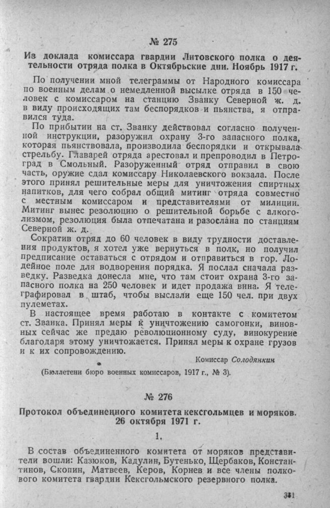Из доклада комиссара гвардии Литовского полка о деятельности отряда полка в Октябрьские дни. Ноябрь 1917 г. // Бюллетени бюро военных комиссаров, 1917 г., № 3.