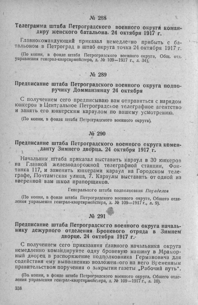 Телеграмма штаба Петроградского военного округа командиру женского батальона. 24 октября 1917 г. // Фонд штаба Петроградского военного округа, общее отделение управления генерал-квартирмейстра, д. № 109—1917 г., л. 34.