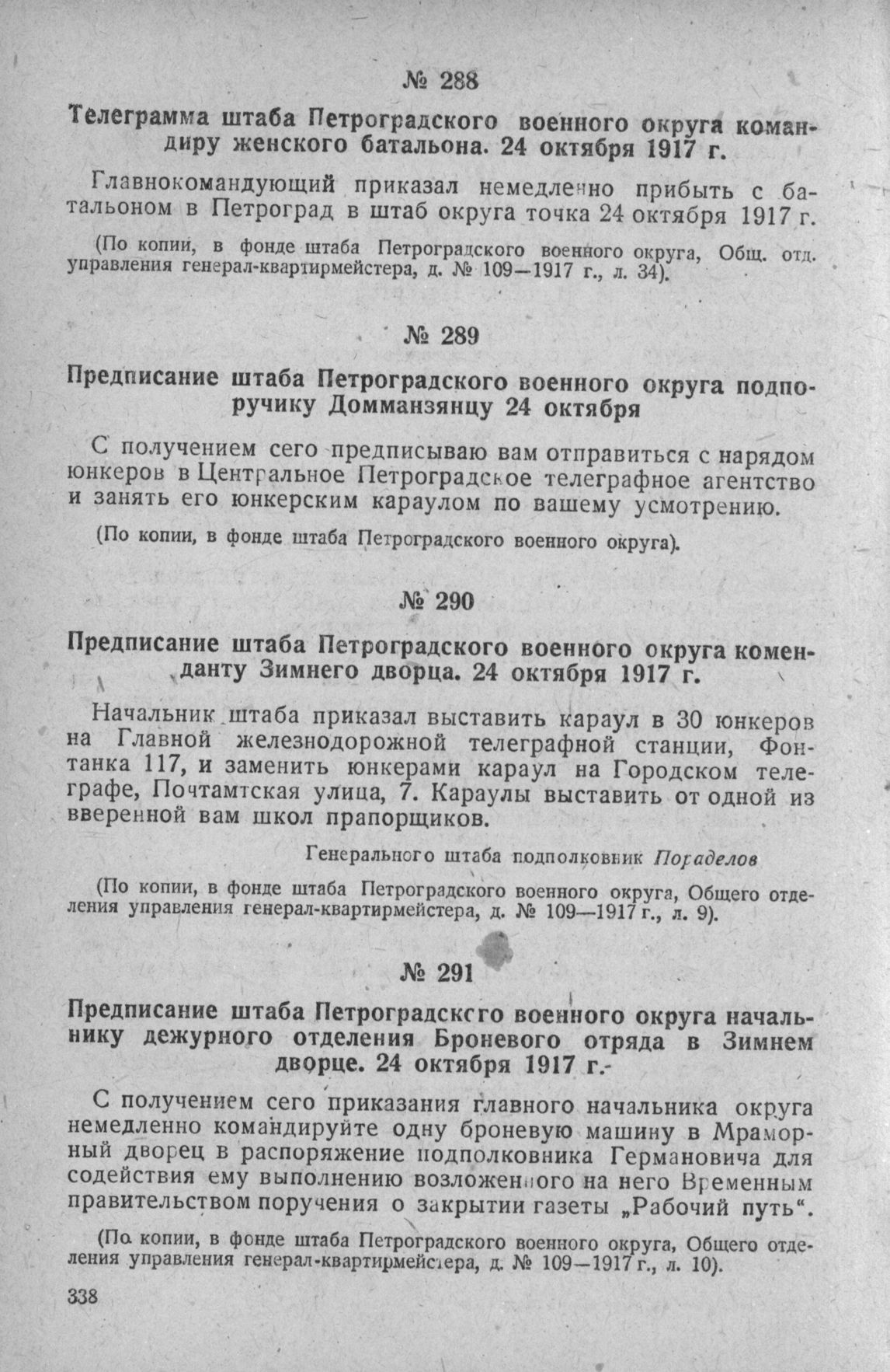 Предписание штаба Петроградского военного округа подпоручику Домманзянцу 24 октября // Фонд штаба Петроградского военного округа