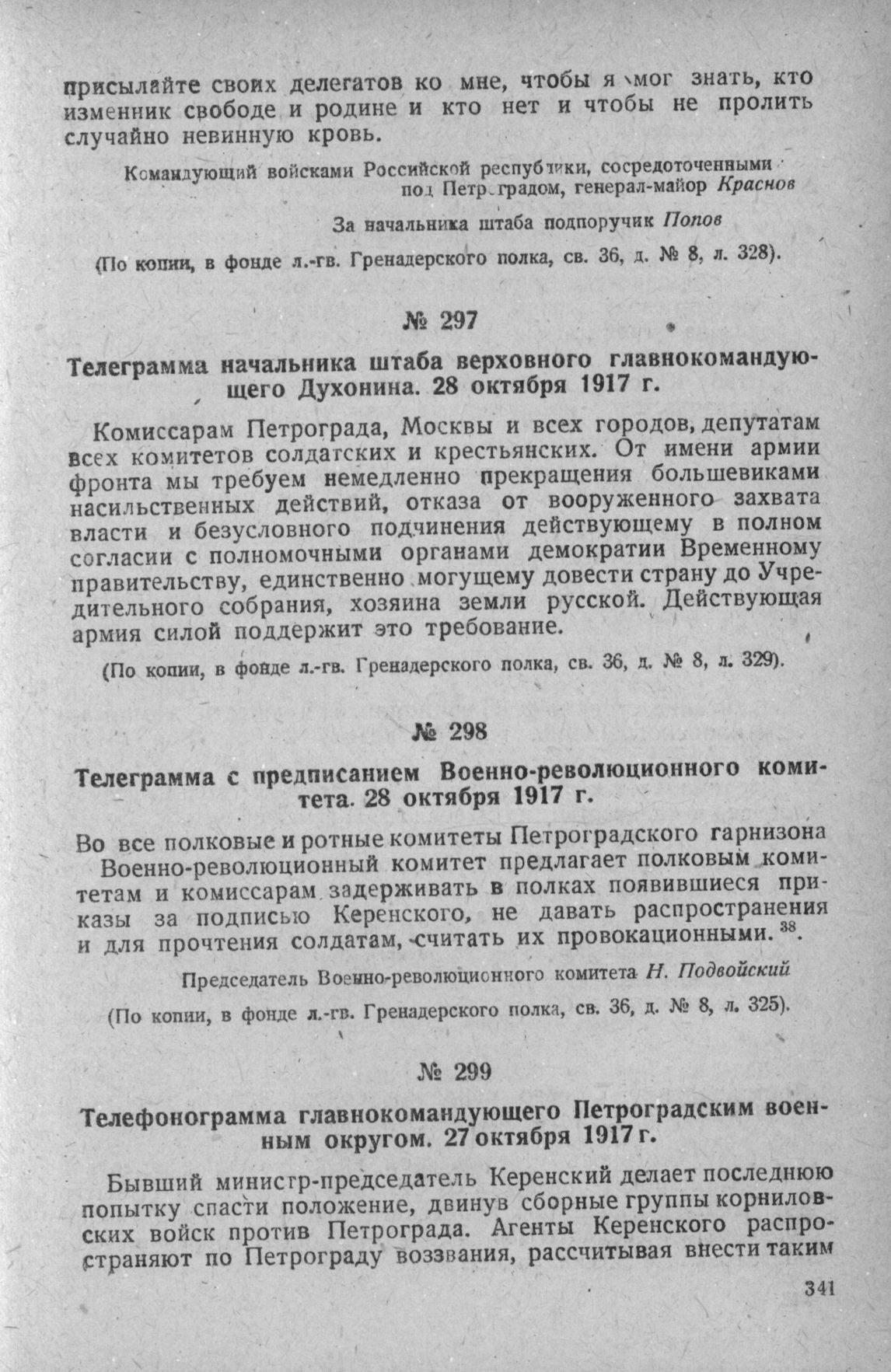 Телефонограмма главнокомандующего Петроградским военным округом. 27 октября 1917 г. // Фонд л.-гв. Измайловского полка, св. 58, дело: «Переписка полкового комитета», л. 86.