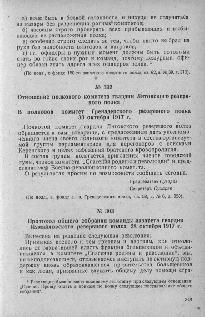 Отношение полкового комитета гвардии Литовского резервного полка в полковой комитет Гренадерского резервного полка. 30 октября 1917 г. // Фонд л.-гв. Гренадерского полка, св. 39, д. № 6, л. 323.