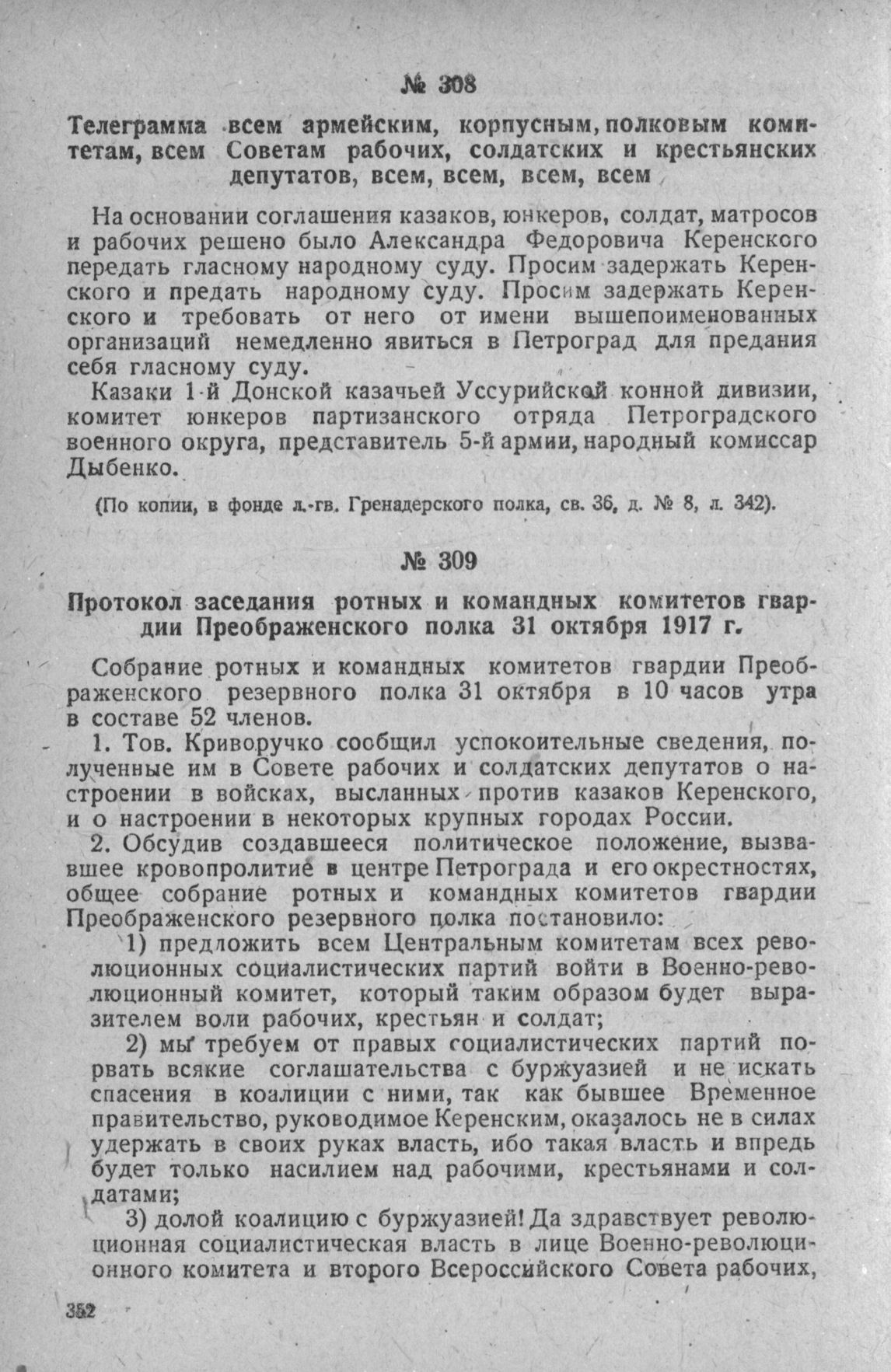 Телеграмма всем армейским, корпусным, полковым комитетам, всем Советам рабочих, солдатских и крестьянских депутатов, всем, всем, всем, всем // Фонд л.-гв. Гренадерского полка, св. 36, д. № 8, л. 342.