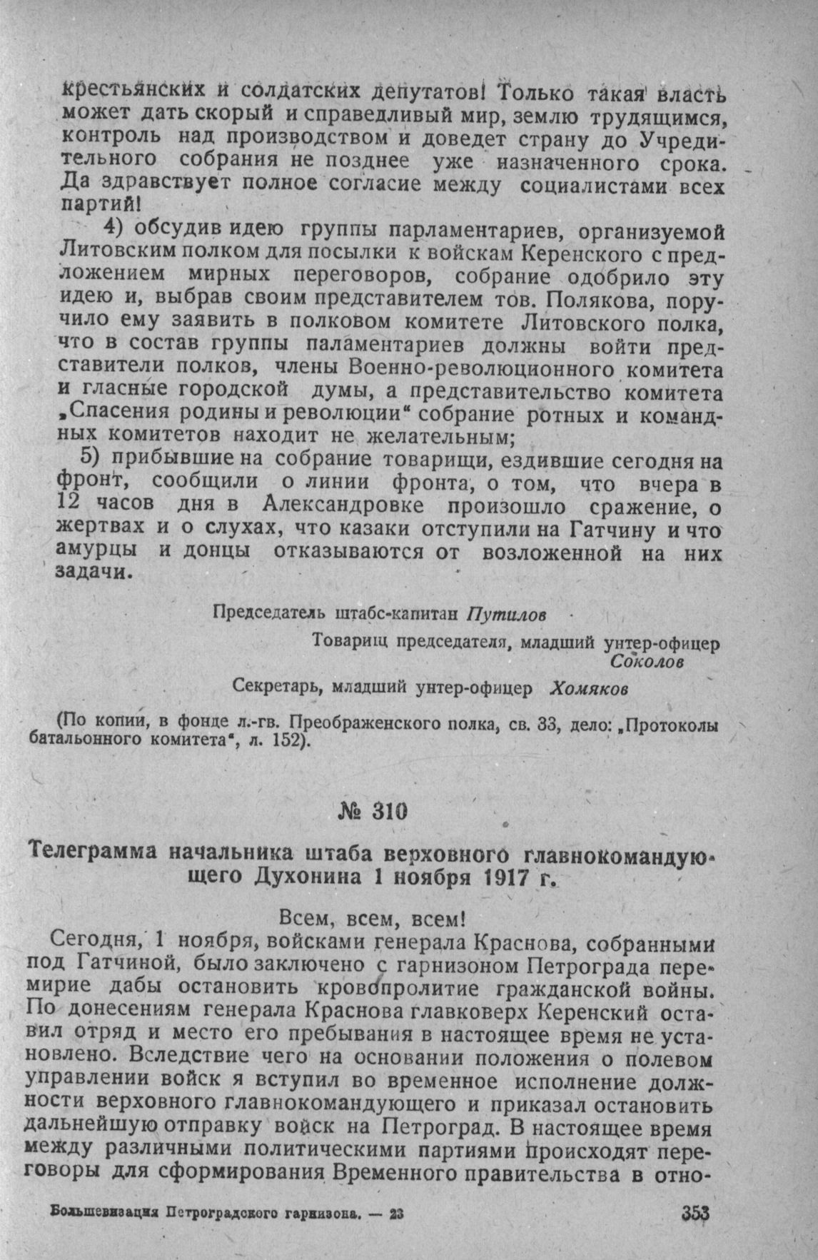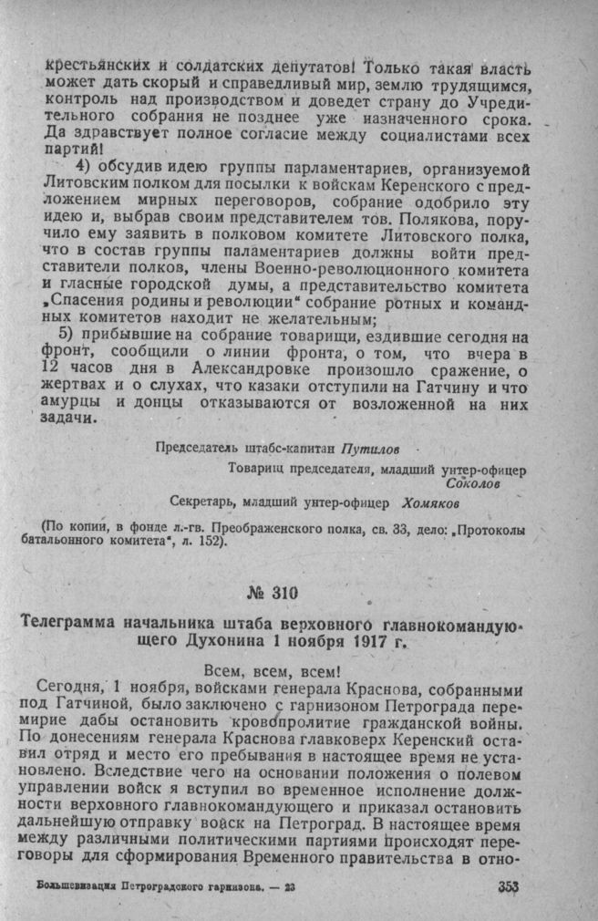 Телеграмма начальника штаба верховного главнокомандующего Духонина 1 ноября 1917 г. // Фонд л.-гв. Гренадерского полка, св. 36, д. № 8, л. 340.