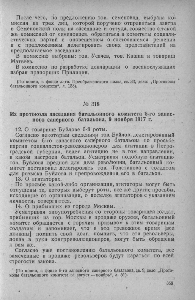 Из протокола заседания батальонного комитета 6-го запасного саперного батальона. 9 ноября 1917 г. // Фонд 6-го запасного саперного батальона, св. 9, дело: «Протоколы батальонного комитета за август — ноябрь», л. 51.