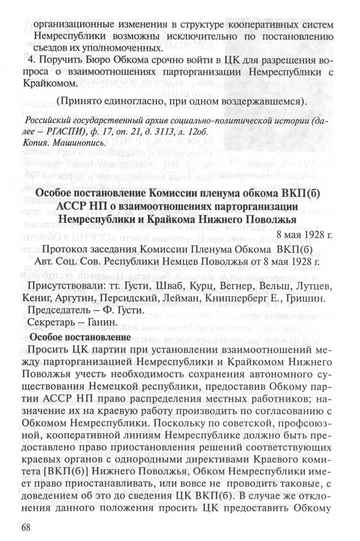 Особое постановление Комиссии пленума обкома ВКП(б) АССР НП о взаимоотношениях парторганизации Немреспублики и Крайкома Нижнего Поволжья. 8 мая 1928 г. // РГАСПИ. Ф. 17. Оп. 21. Д. 3113. Л. 14об. Заверенная копия. Машинопись.